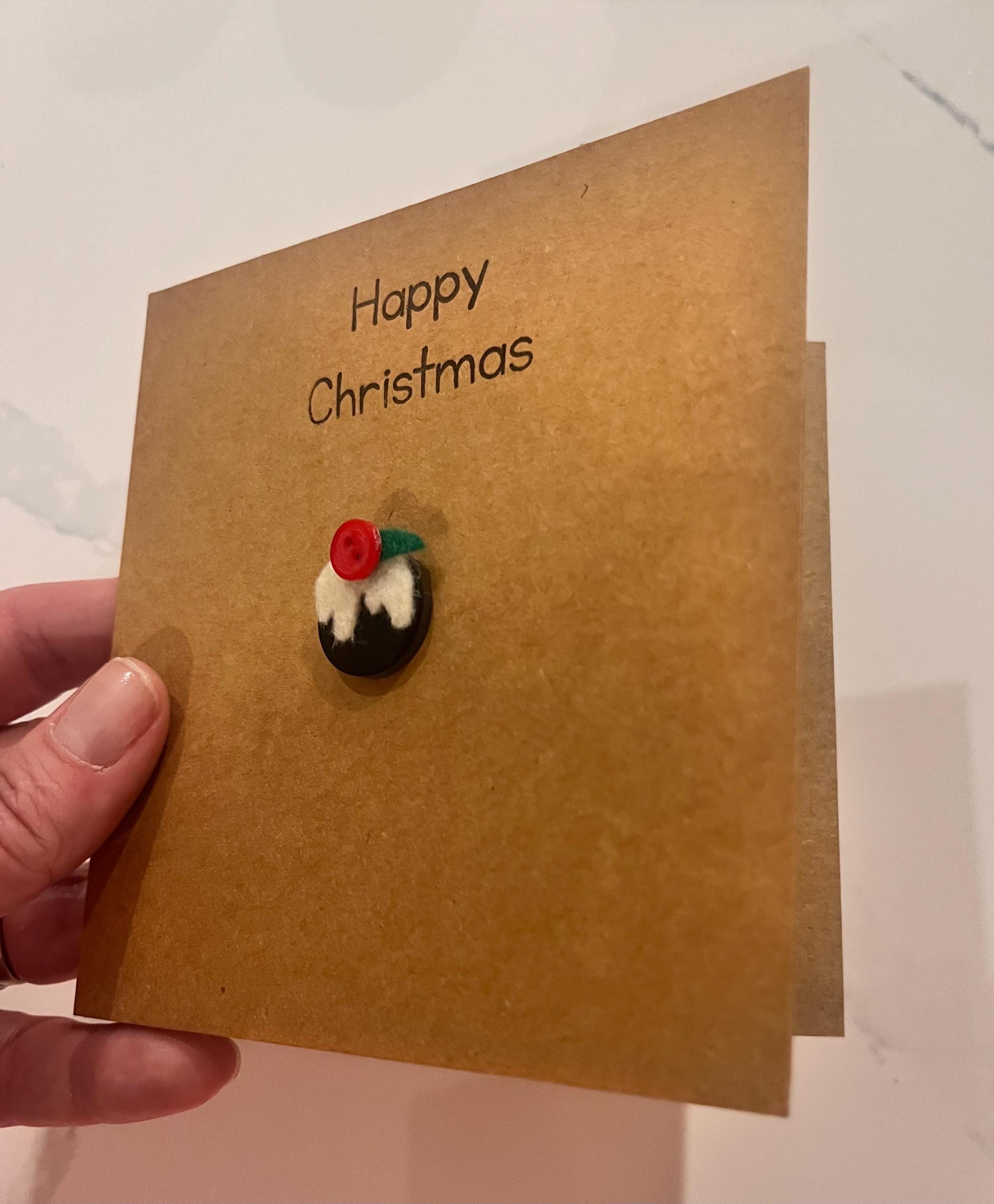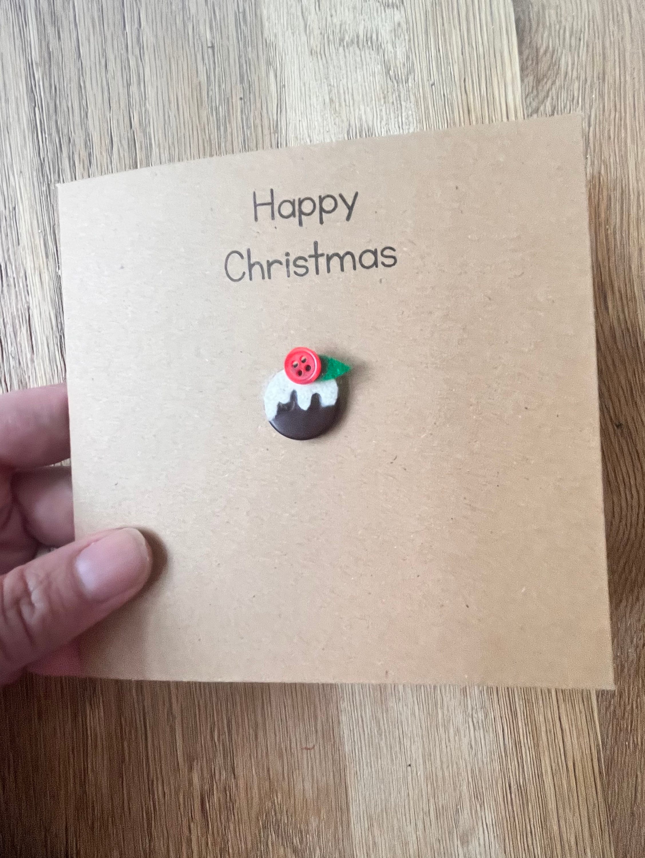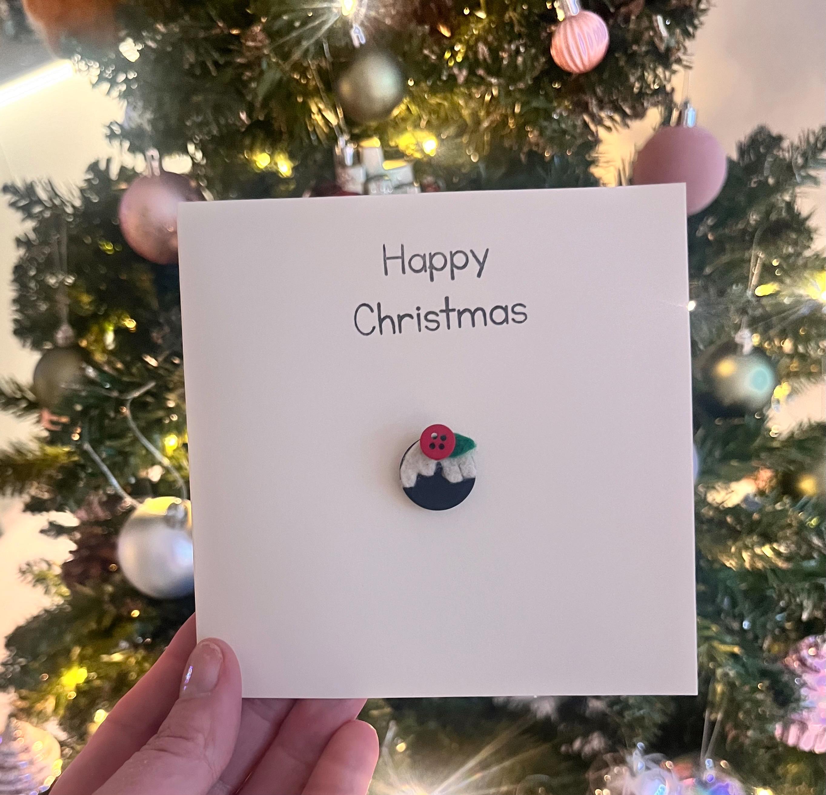This card is my Christmas Pudding button card ,handmade by me and stamped with “happy Christmas “ in black ink.