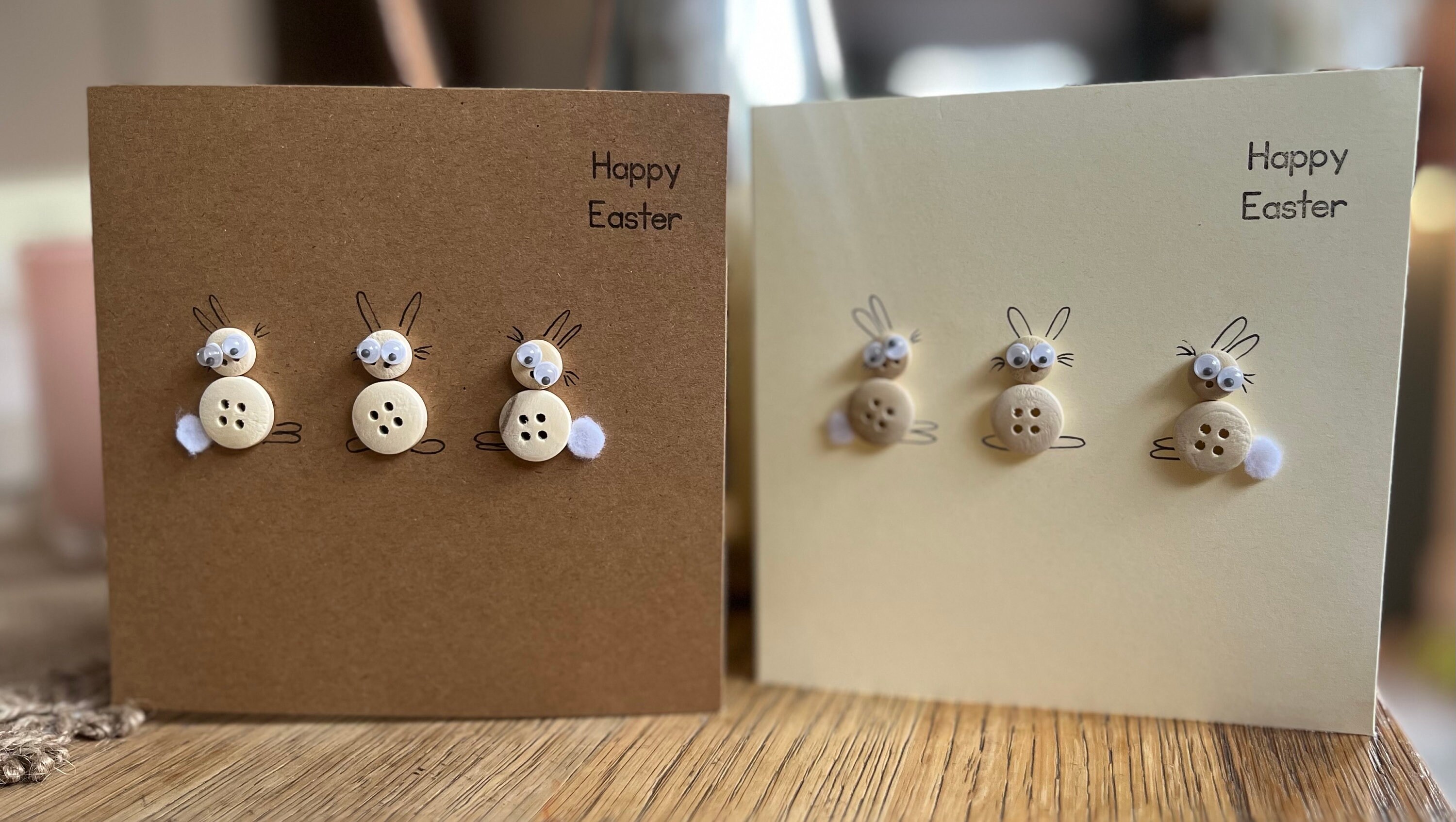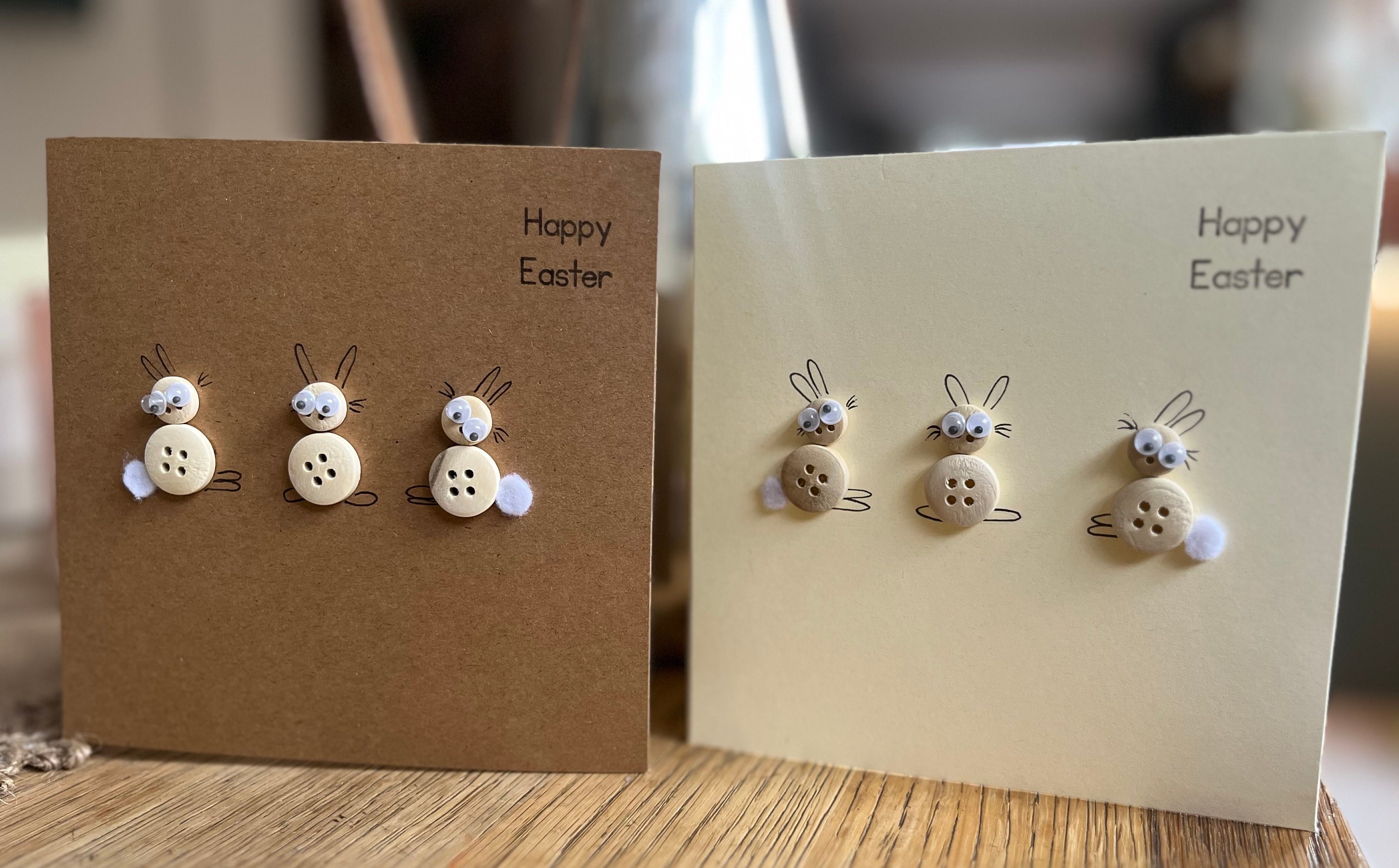 These cards have 3 cheeky bunnies made from wooden buttons and white felt tails. The bunnies have googly eyes and hand drawn ears, whiskers and feet. . - all handmade by me and all stamped with “happy Easter “ in black ink stamp on the front.
