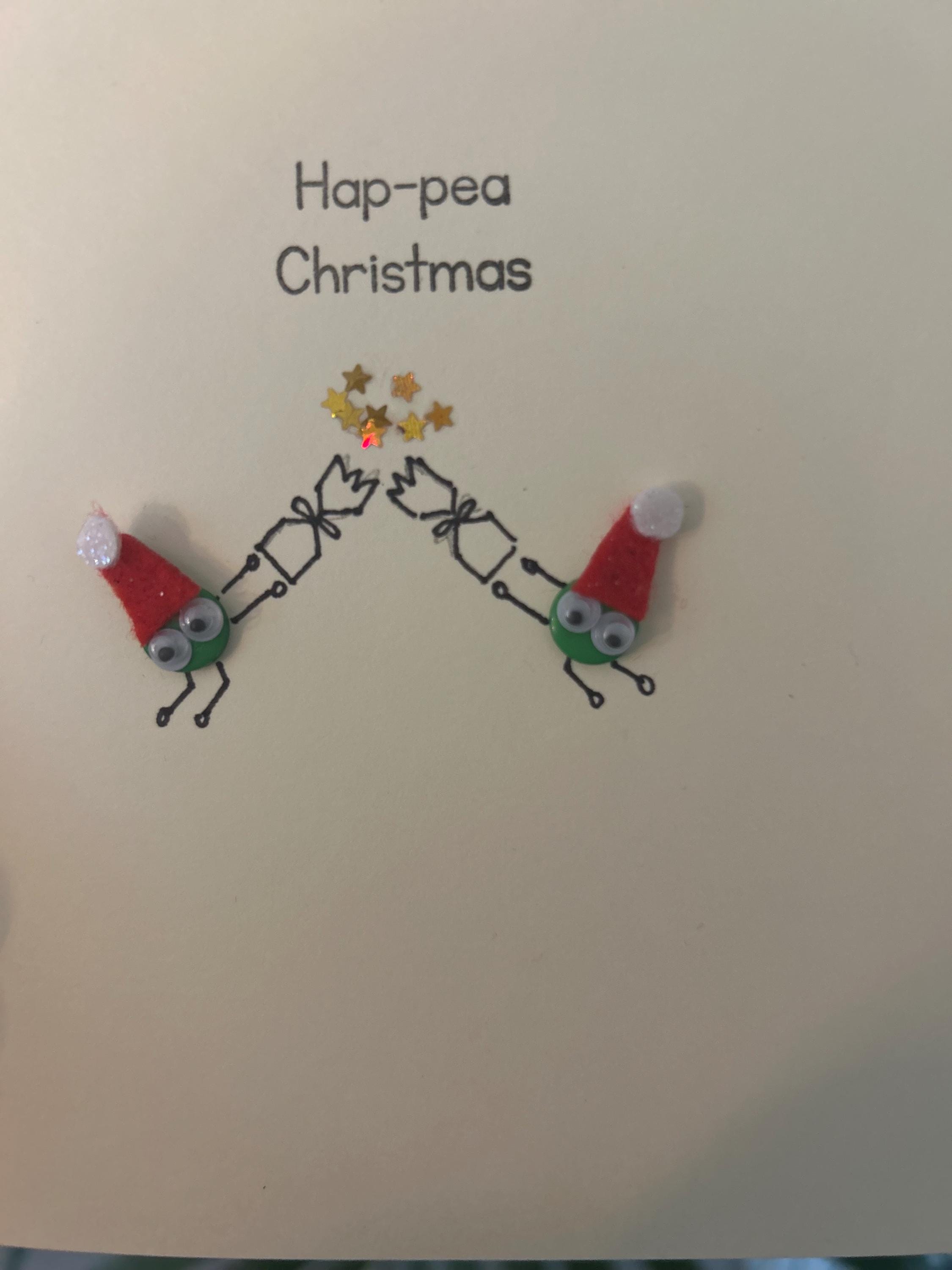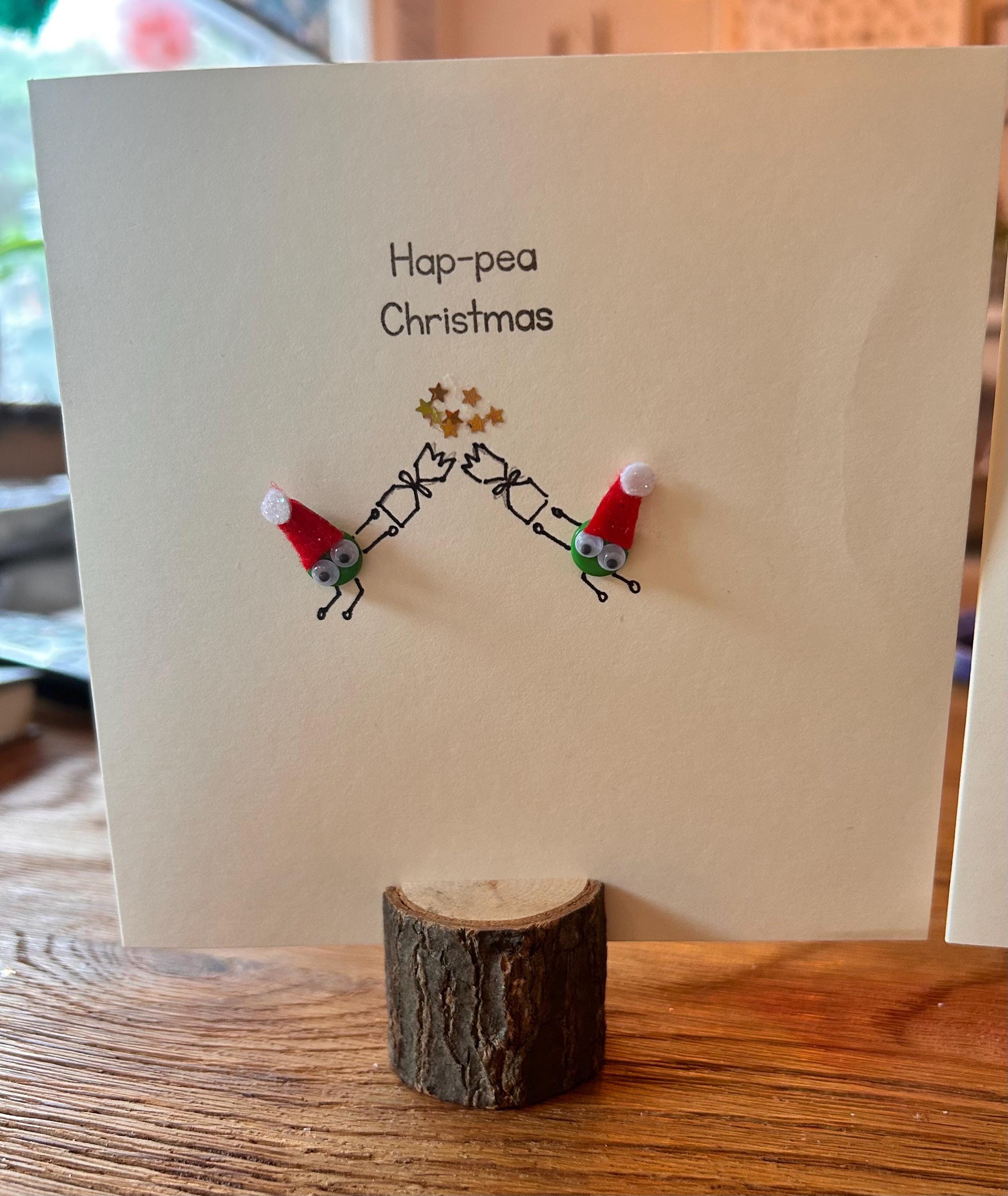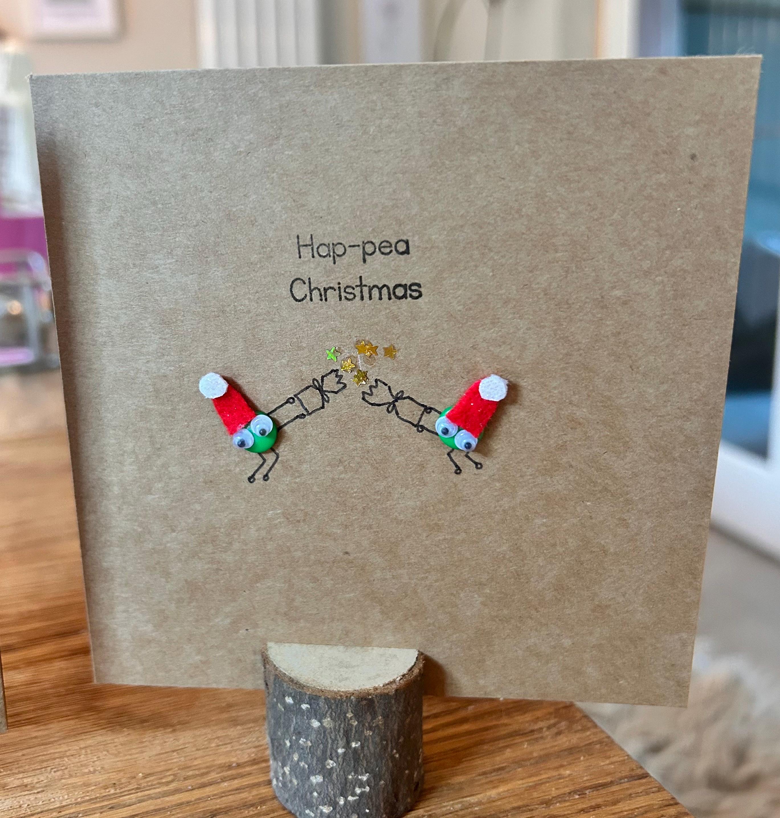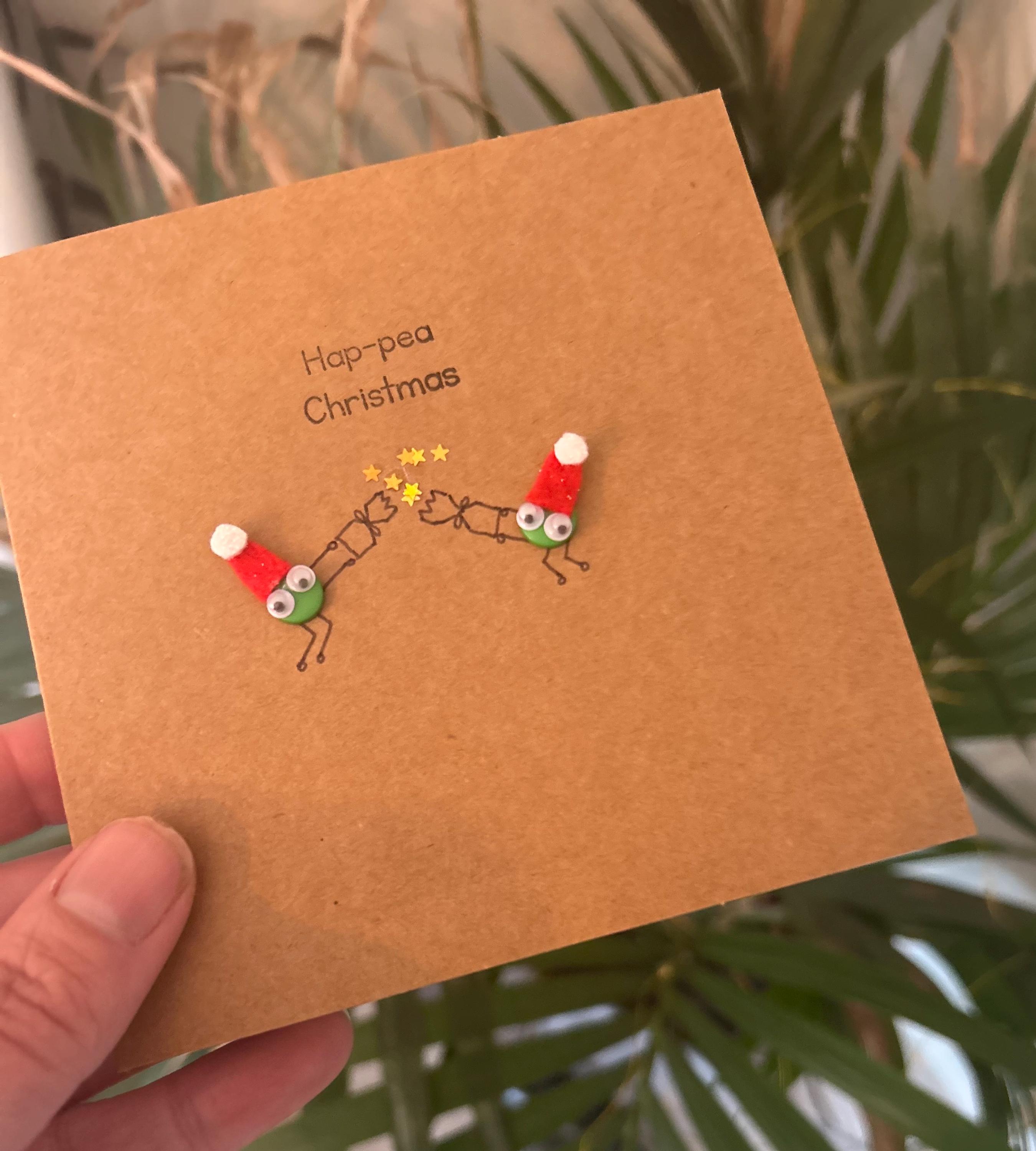 The card has then been printed with “Hap-pea Christmas ”. ink stamp in black ink on the front .