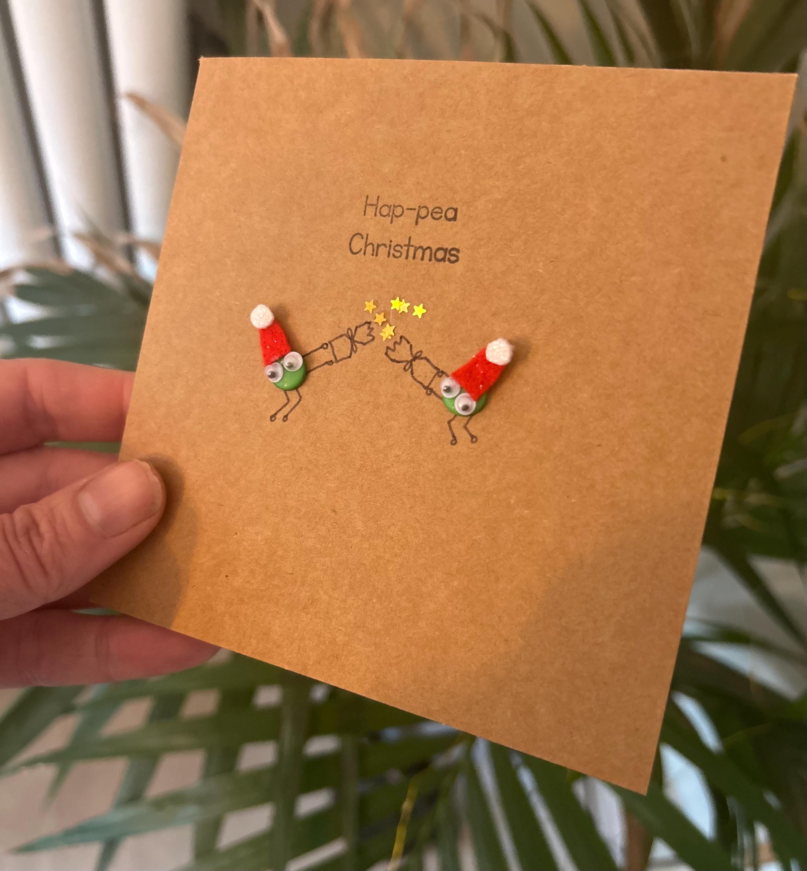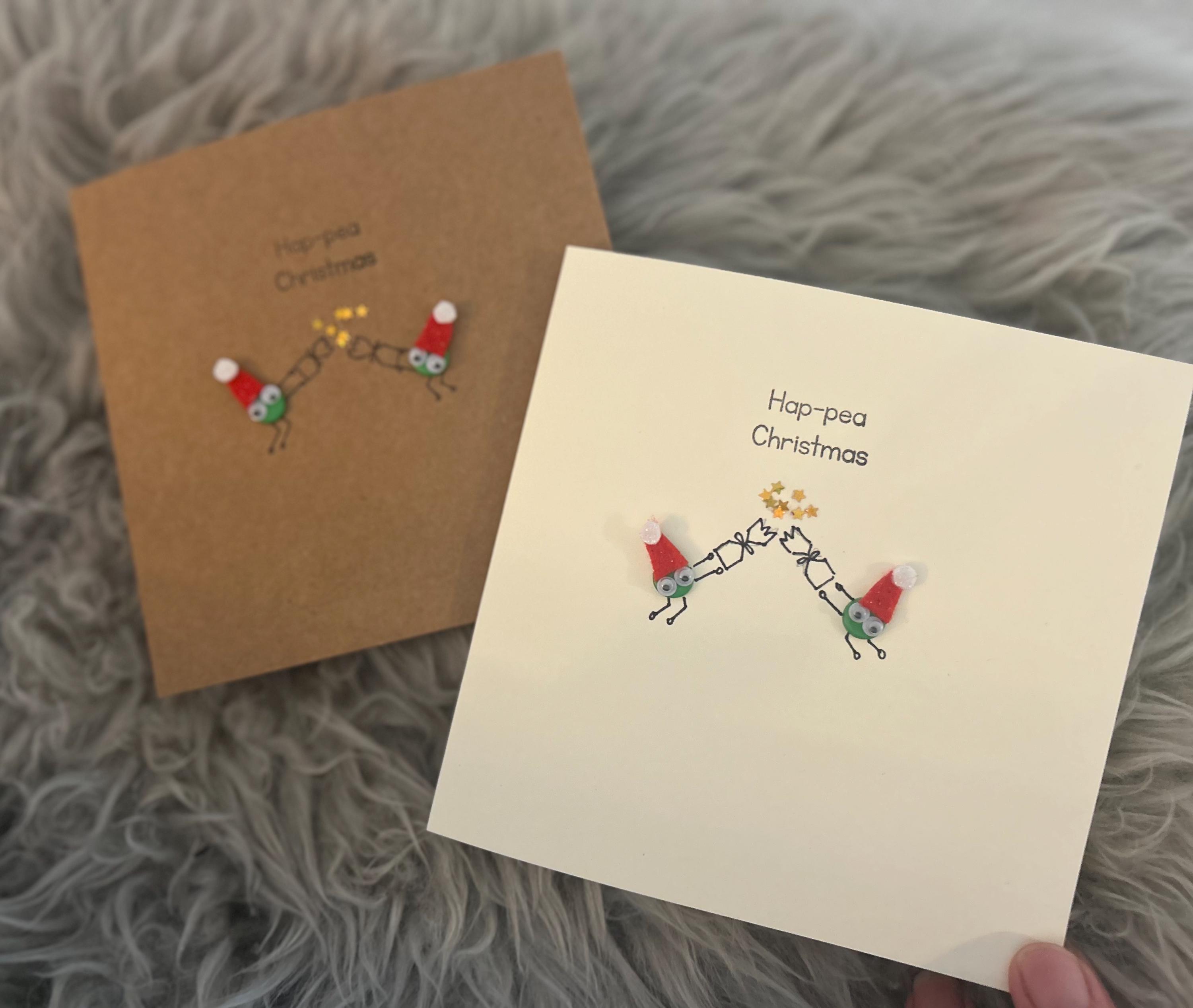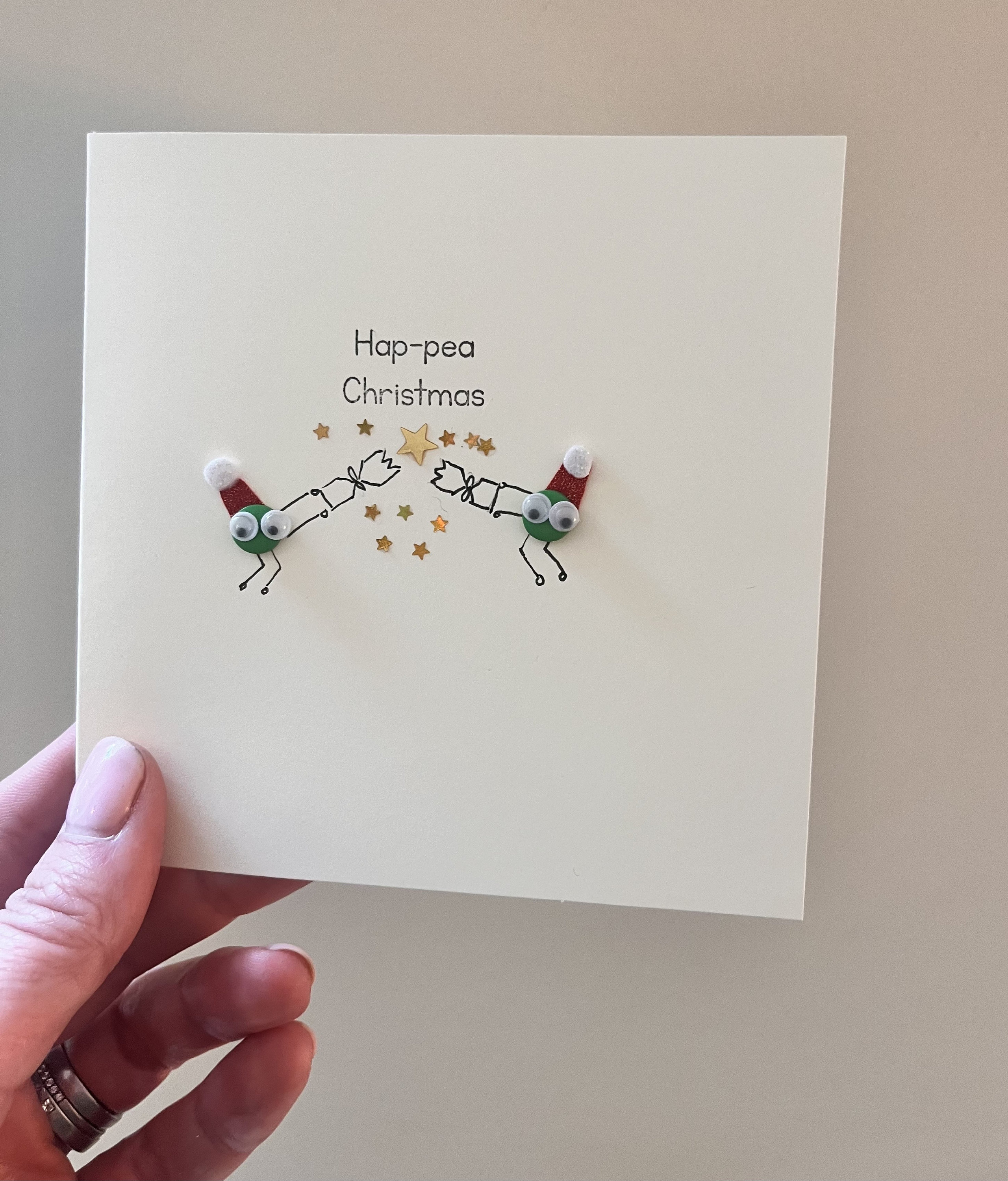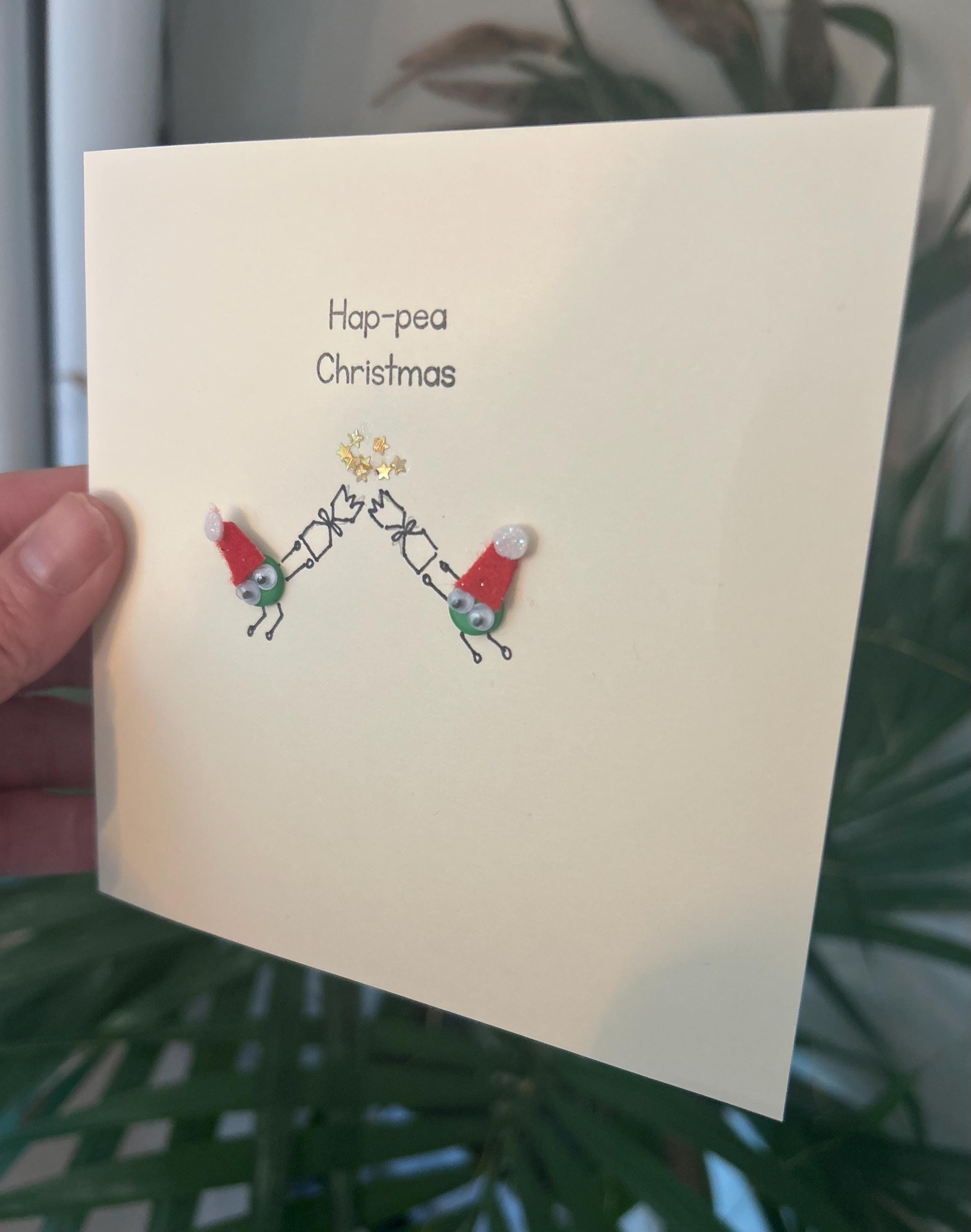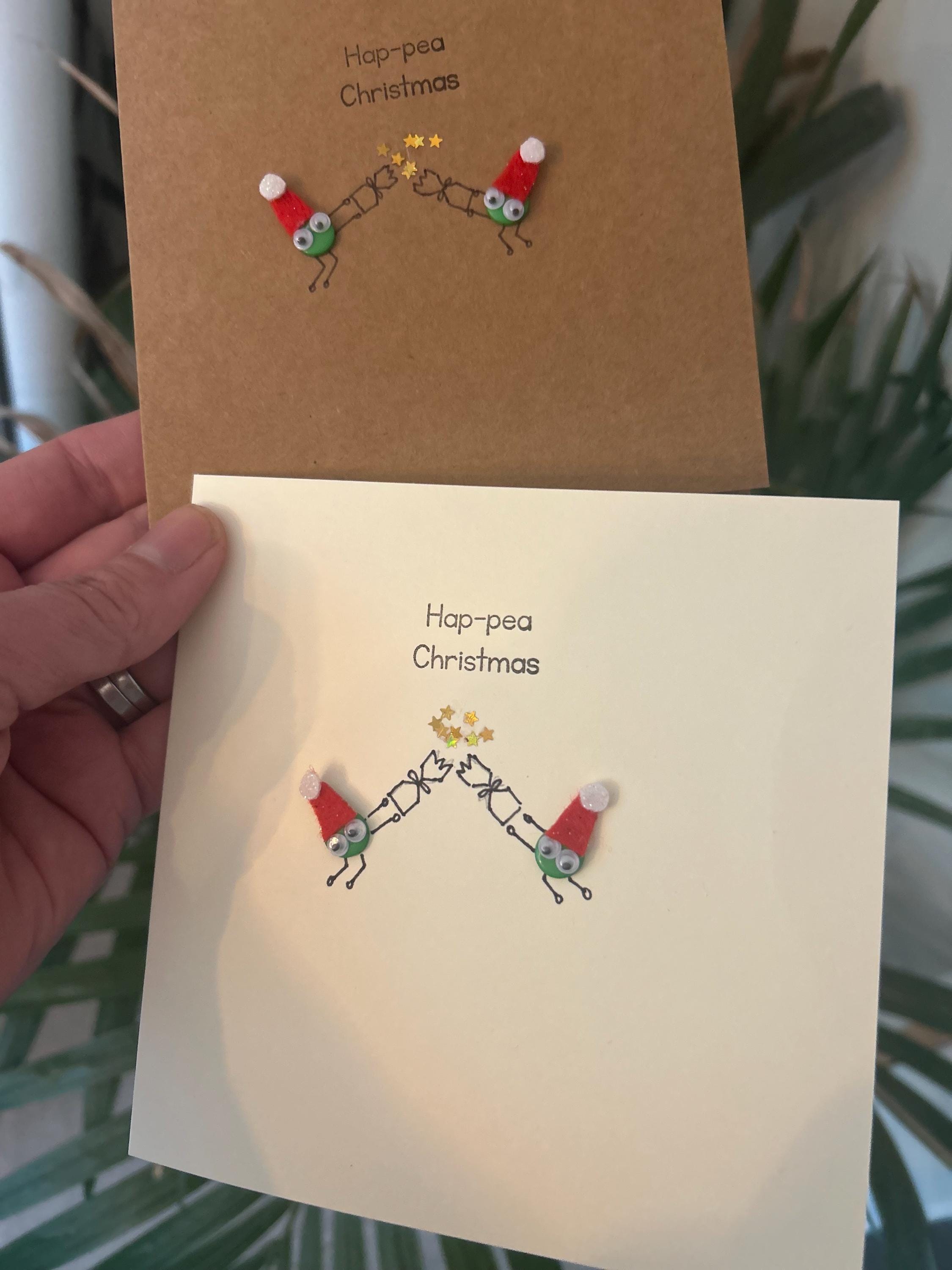 Each card is made with 2 green button peas pulling a hand drawn Christmas cracker with some Christmas sparkles.