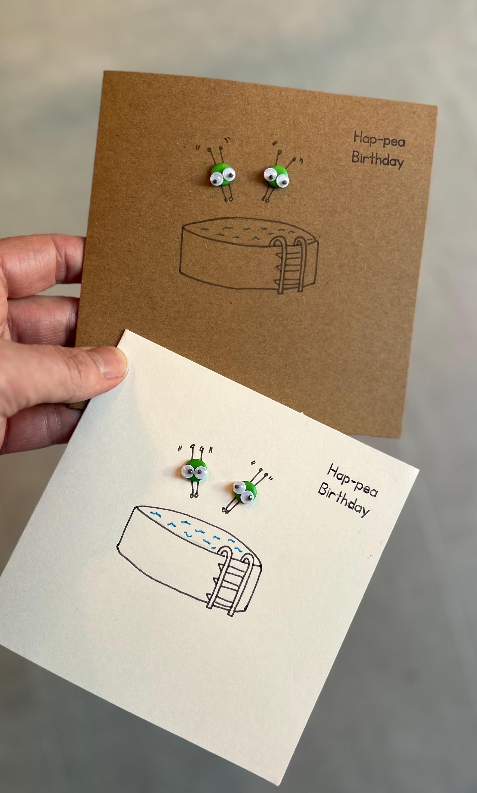 Each card is made with 2 green pea buttons with googly eyes enjoying diving into a pool. each card is hand drawn by me.