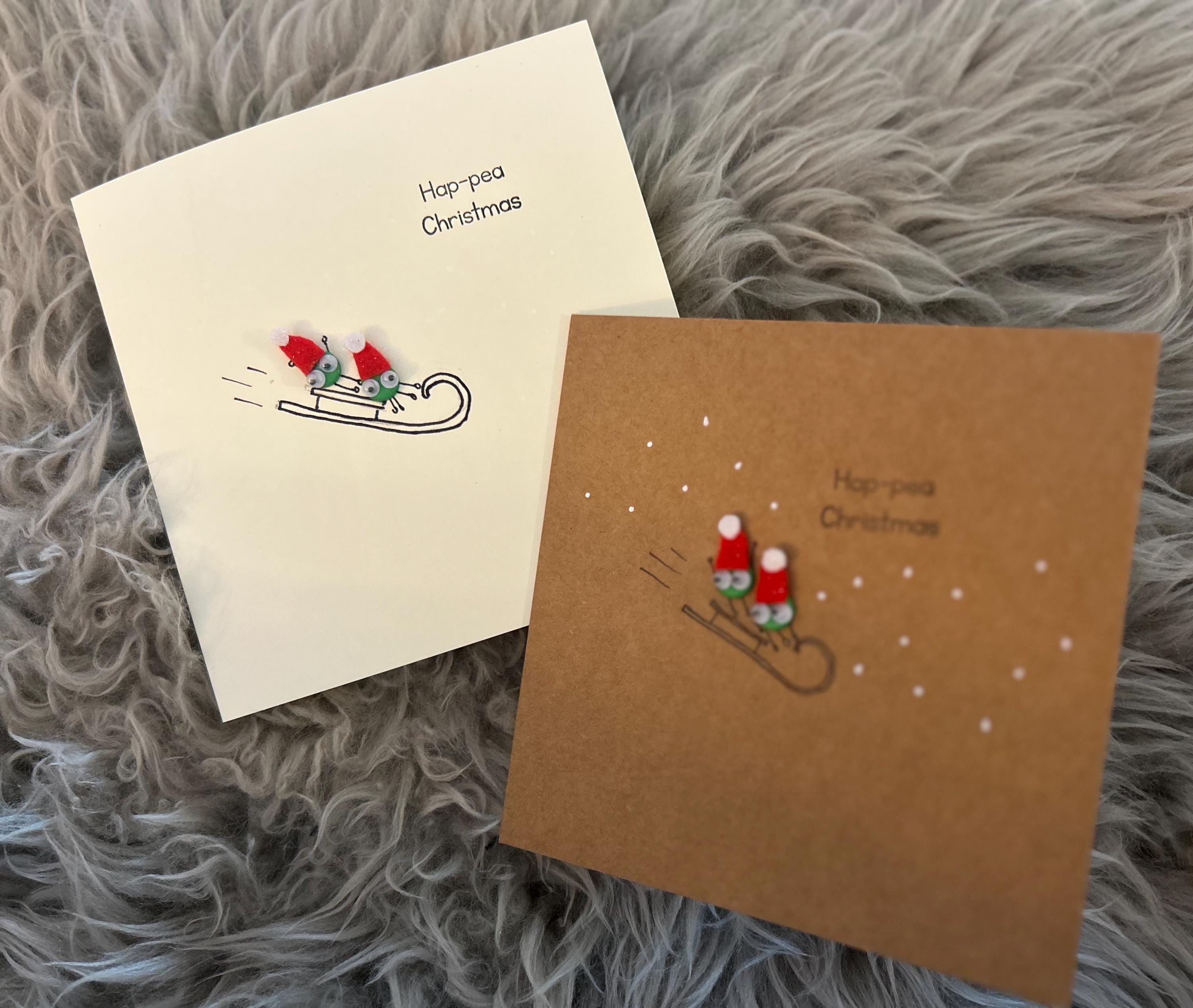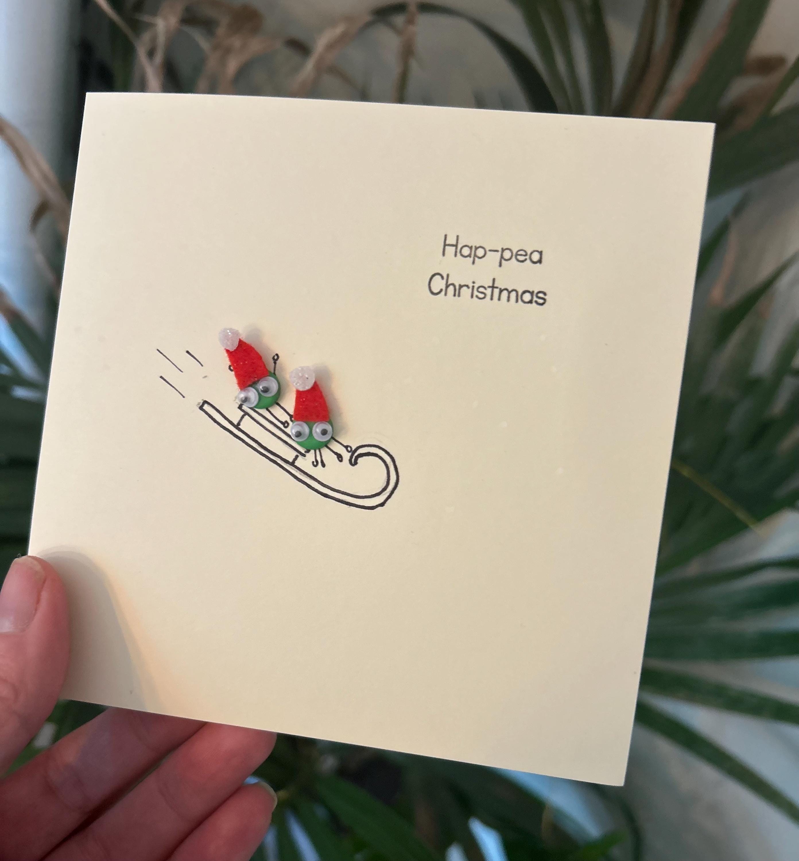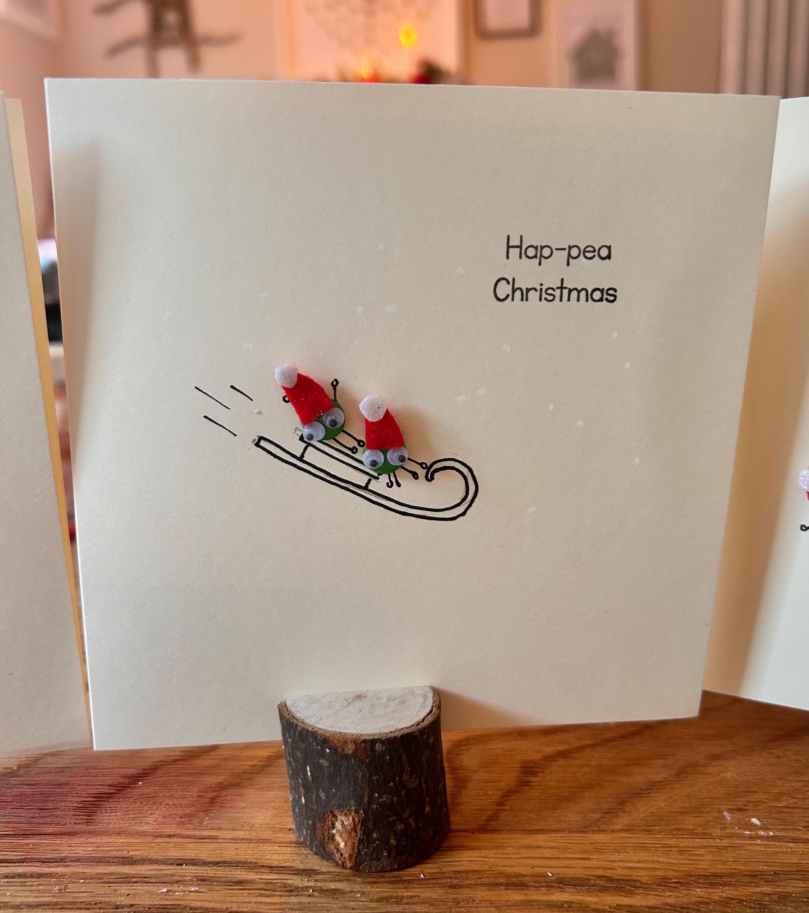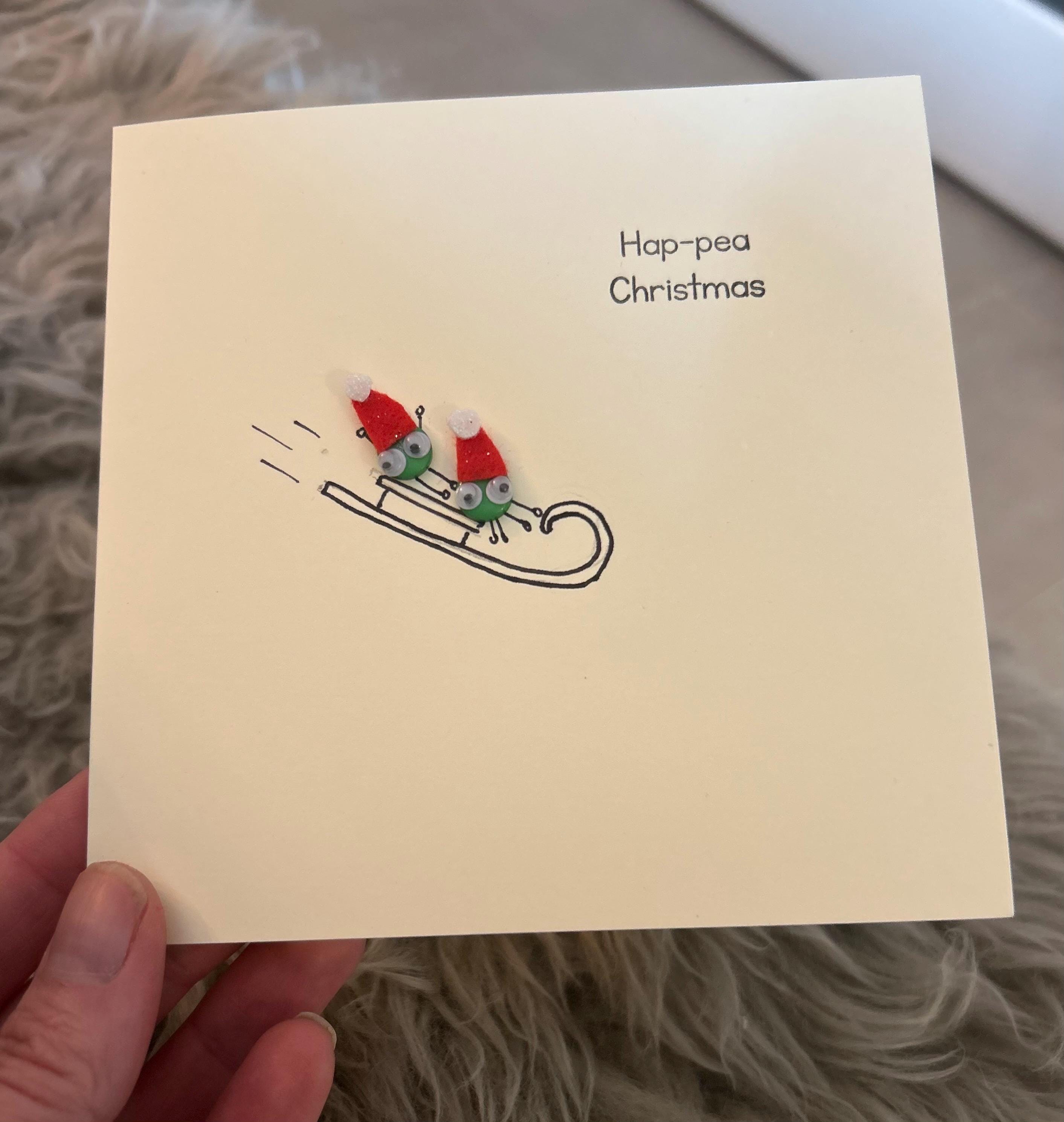 Each card is made with 2 green button peas with Christmas hats, on a hand drawn sled wizzing down a snowy slope. The card has white hand drawn snow flakes added .