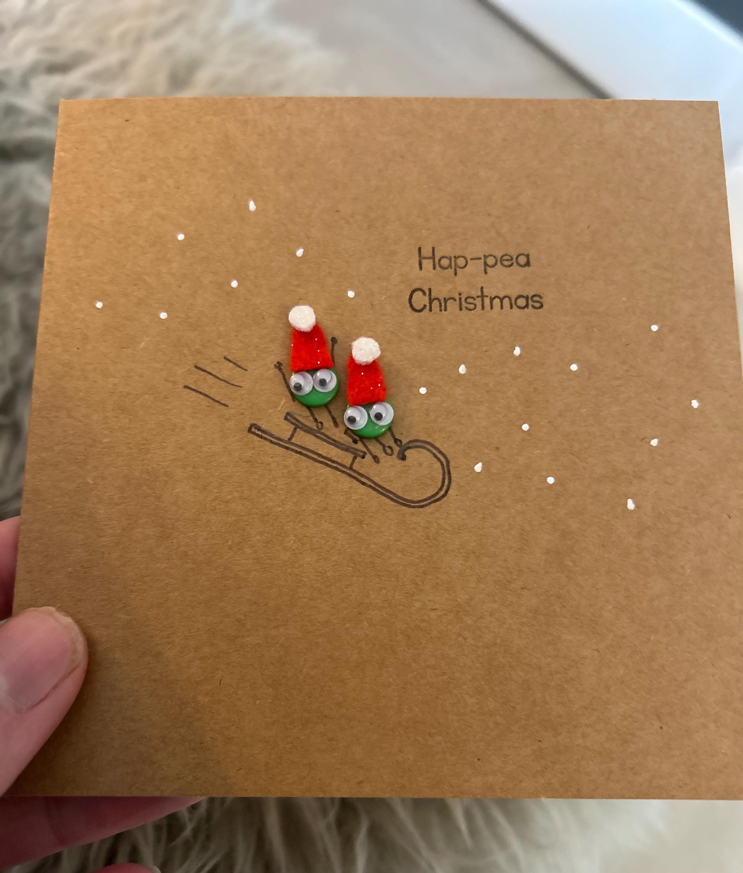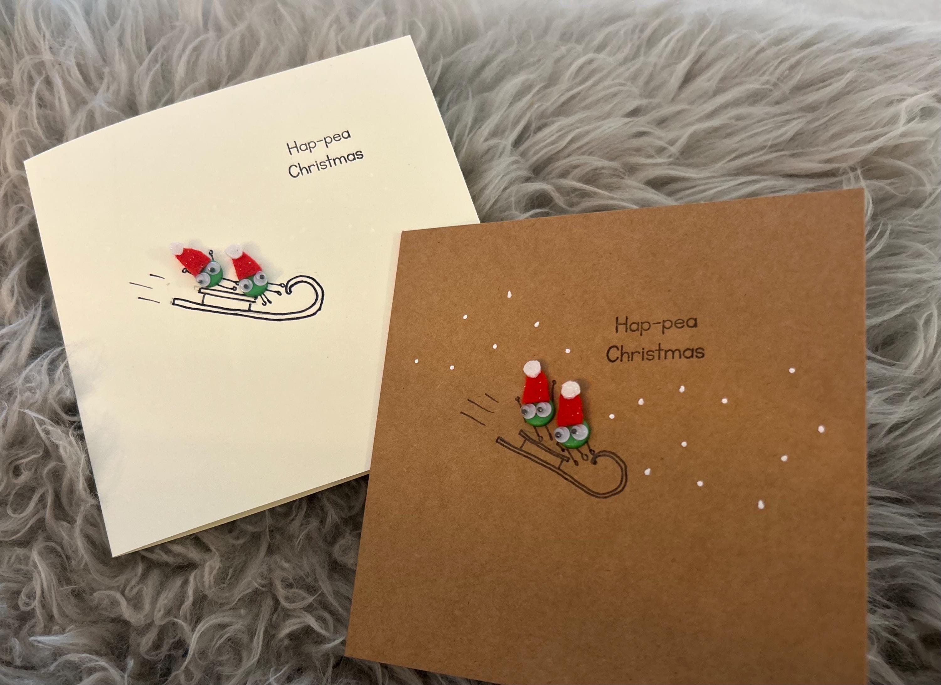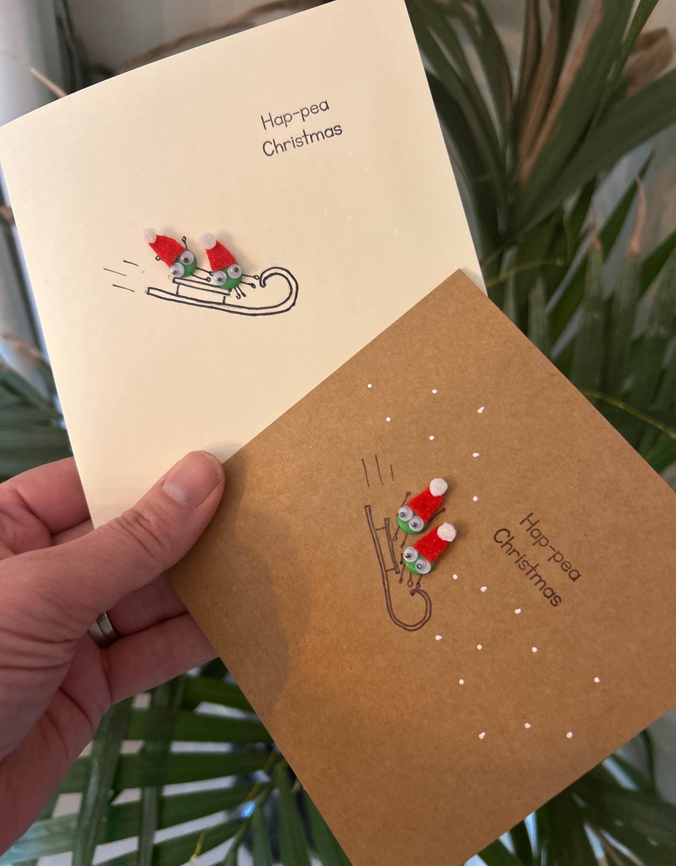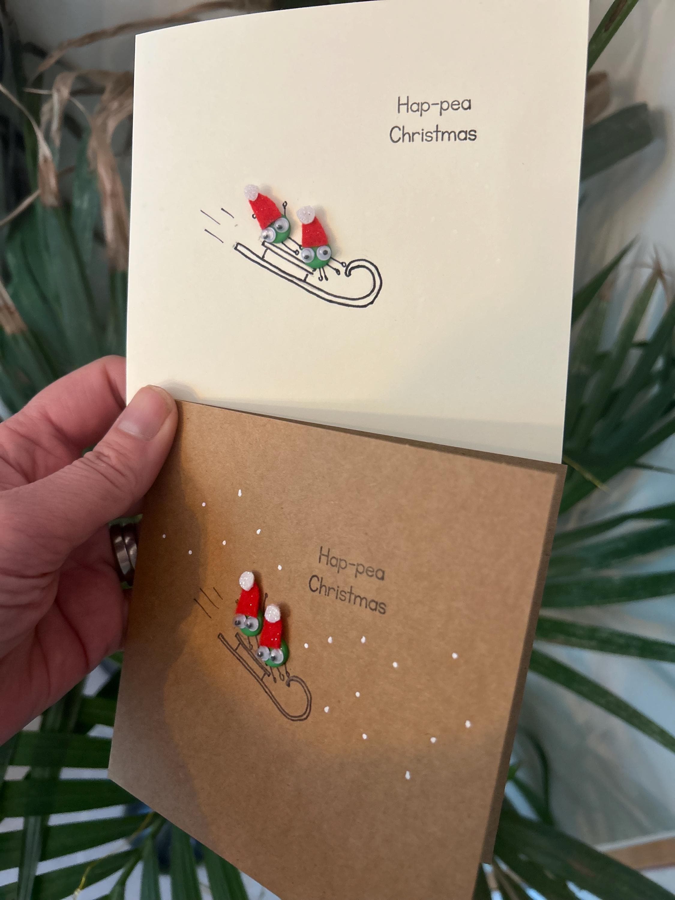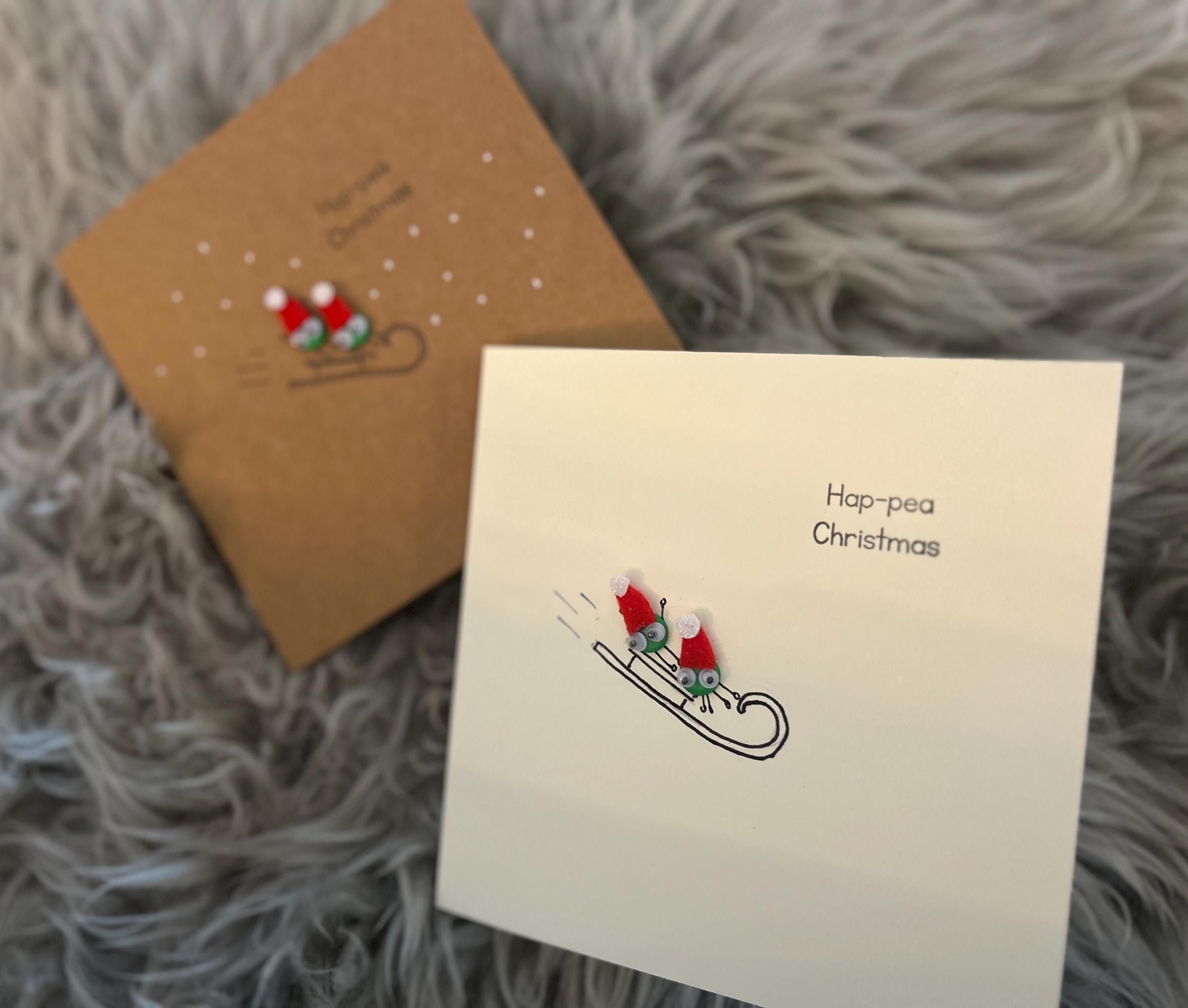 Each card is made with 2 green button peas with Christmas hats, on a hand drawn sled wizzing down a snowy slope. The card has white hand drawn snow flakes added .