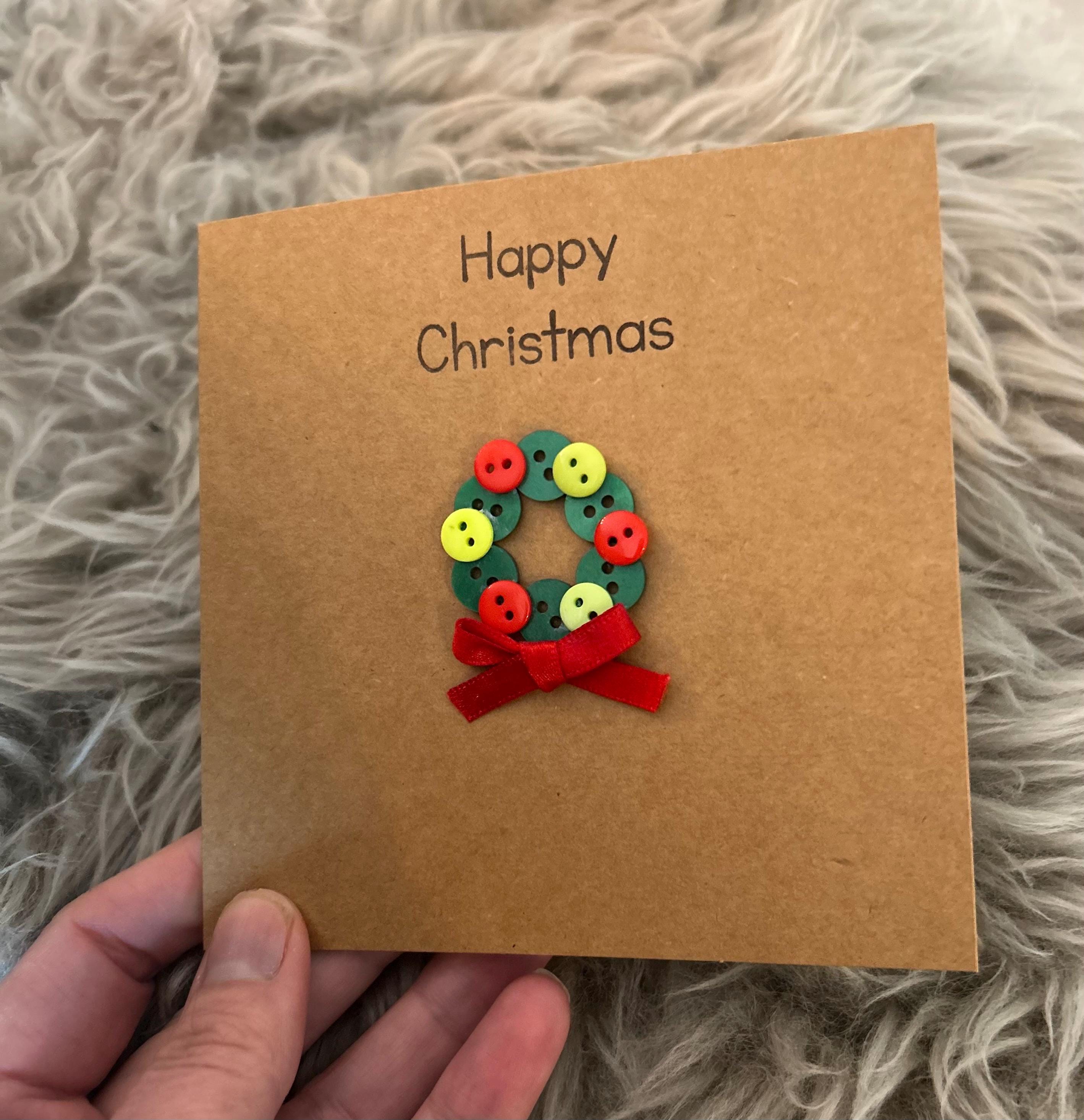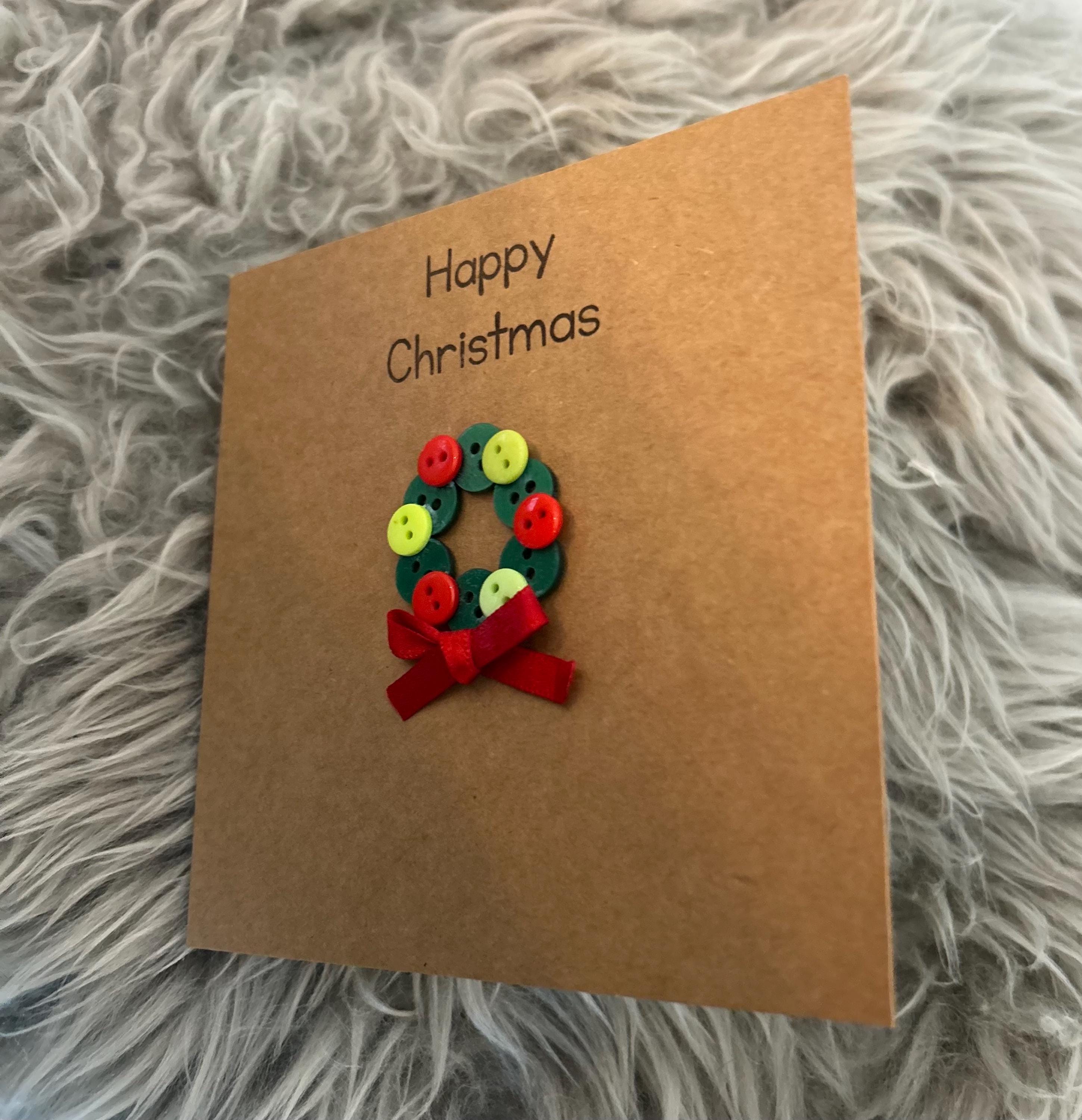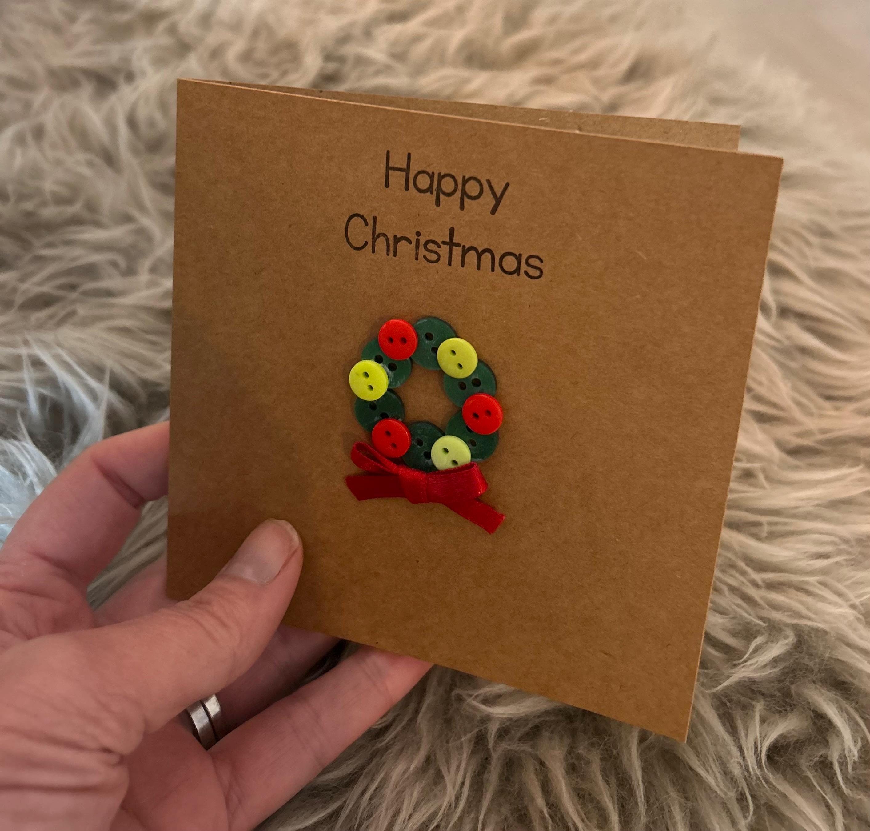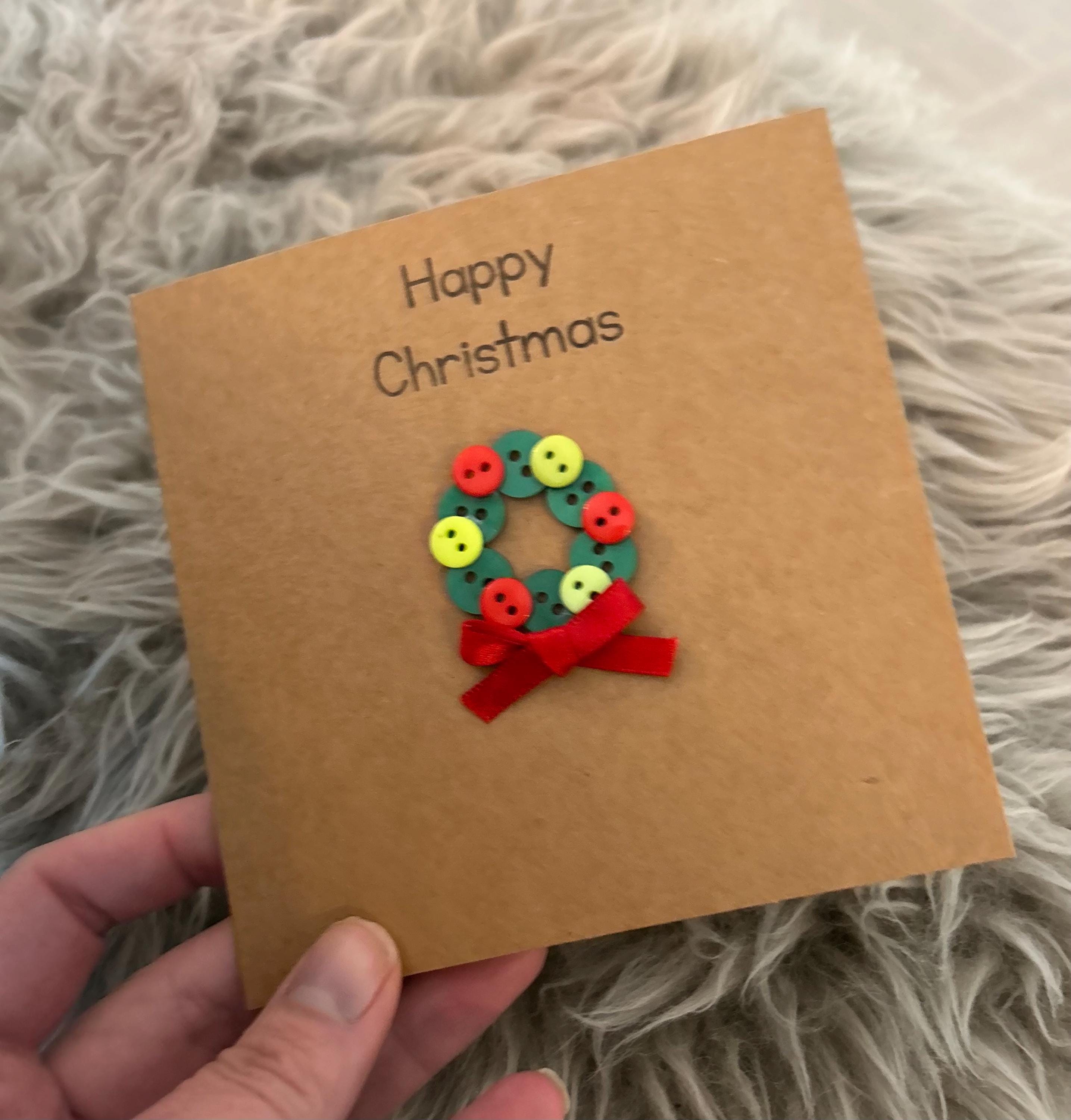 This card is my Christmas wreath button card. green and red buttons with a red ribbon. Handmade by me and stamped with “happy Christmas “ in black ink.